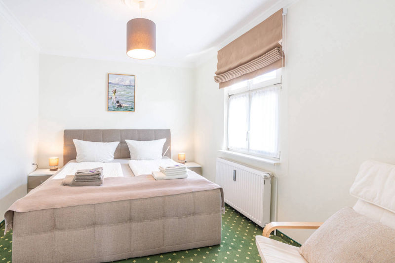 Die 64m² große Ferienwohnung im ersten Obergeschoss bietet Platz für 4 Personen, zwei Doppelzimmer, einen großzügigen Wohn- und Essbereich, eine vollausgestattete Küche und ein Badezimmer mit Dusche. Außerdem vefügt die Wohnug über eine geschlossene Veranda.